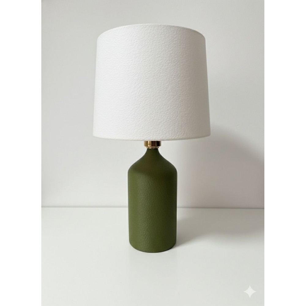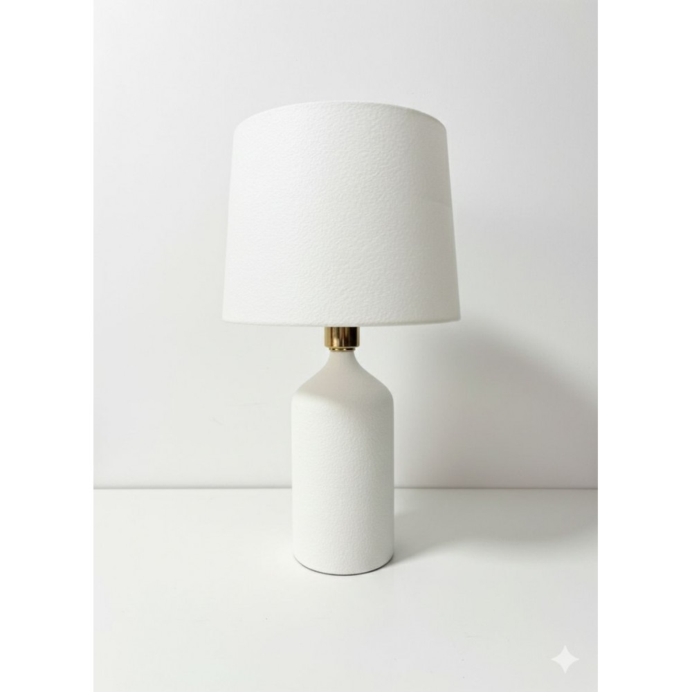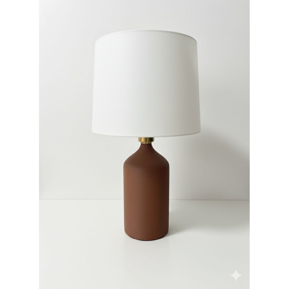 "Toprak tonlarının sıcaklığı ve minimalizmin zarafeti: Terakota rengi seramik gövdesi ve keten başlığıyla modern mekanlara doğal bir dokunuş sunan şık masa lambası."